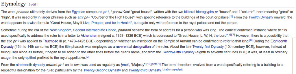 Unfortunately, the Akhenaten statement was cited with a resource that I could not find online. I mean, I found a part of it, but only the part that showed pictures of hieroglyphs. Can’t do anything with that. But I did find another source by the same author that at least confirmed the papyrus in question did address the king as “pharaoh,” though it made no comment about this being the earliest known reference. Still, a statement from a direct researcher: cite that.