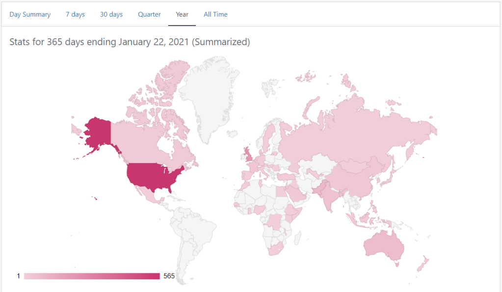 Oh well. The random clicks aren’t particularly interesting to me since they don’t provide feedback. Sometimes I can take a guess by the timing and origin of a view that there is a real person on the other side who actually follows my blog. (Hi Pakistan friend!) But I do enjoy seeing my world map get colored in. Here’s my map for 2020, and all the countries (and VPNs) from which a person or bot has viewed my page.