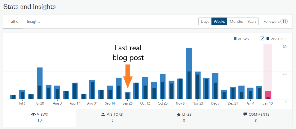 I’m not entirely convinced that those visits are not just bots sweeping the web for a sucker, since the views are often of random posts even when from the same “visitor.” But given how dead traffic to my blog has been for the previous three years, does this mean that mere longevity is moving my blog to a different category in the database algorithms?
